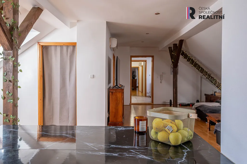 Byt vznikl vestavbou do půdního prostoru a zabírá celou délku domu, přibližně 24 metrů. Díky tomu nabízí netypické řešení prostoru a větší variabilitu využití jednotlivých místností. Dispozice je řešena jako 4+kk, přičemž jednotlivé části bytu na sebe navazují v podélném uspořádání. Prostor působí otevřeně a umožňuje případné úpravy dle potřeb nového vlastníka.