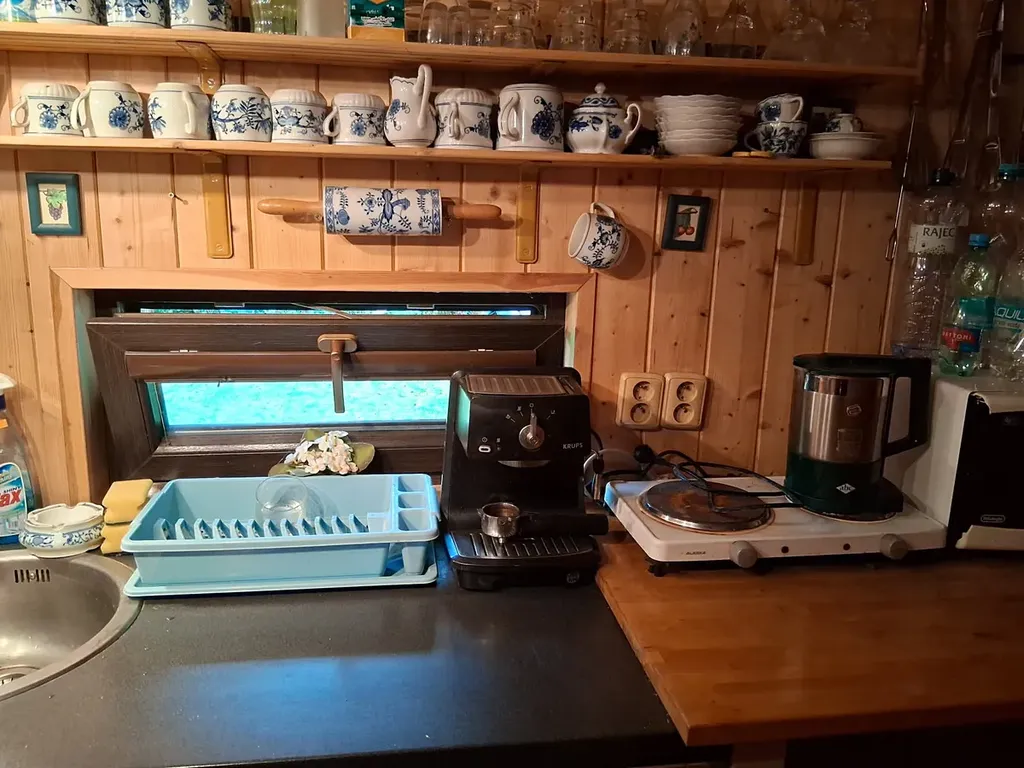 Malá kompletně vybavená kuchyň, obývací pokoj a místnost s umyvadlem a přenosným WC.