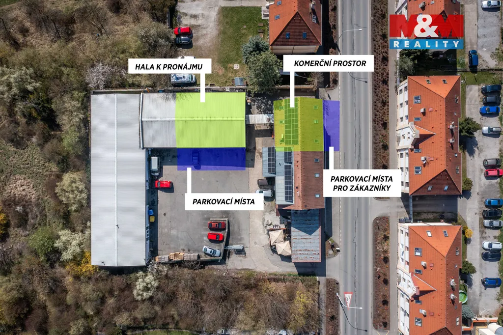 Pronájem komerčního areálu s halou a obchodním prostorem, parkování. Nabízíme k pronájmu komerční areál s výbornou dostupností a širokým využitím. Součástí je prostorná skladová hala o ploše cca 187 m² se sekčními vraty (4 × 4 m), vhodná pro skladování, výrobu či logistiku. Hala disponuje také kanceláří (cca 16 m²) a skladovým mezipatrem. Na halu navazuje samostatný komerční prostor o velikosti cca 53,8 m², vhodný jako prodejna, showroom nebo zázemí firmy. Součástí je technická místnost, koupelna a WC. V areálu je dostatek parkovacích míst jak pro zaměstnance, tak pro zákazníky, včetně pohodlného zásobování a dobrého vjezdu. Areál je vhodný pro kombinaci podnikání – sklad, e-shop, servis, menší výrobu či obchod. Nájemné: 89.000 Kč / měsíc