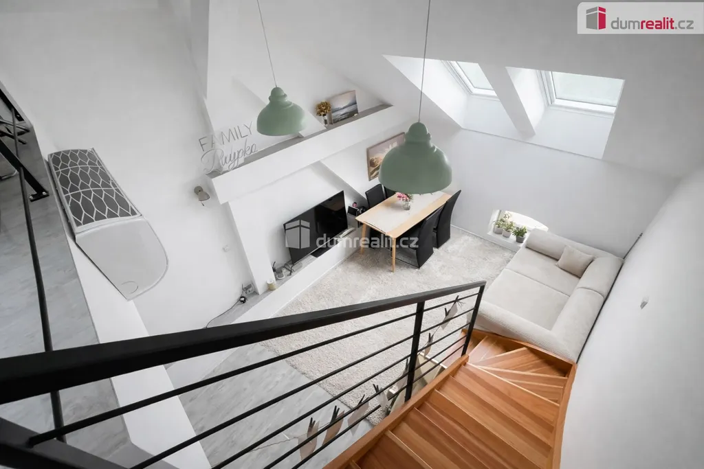 Byt je řešen ve dvou úrovních. Ve spodním podlaží se nachází vstupní chodba, koupelna se sprchovým koutem, toaletou a pračkou a dále hlavní obytný prostor propojený s plně vybaveným kuchyňským koutem.