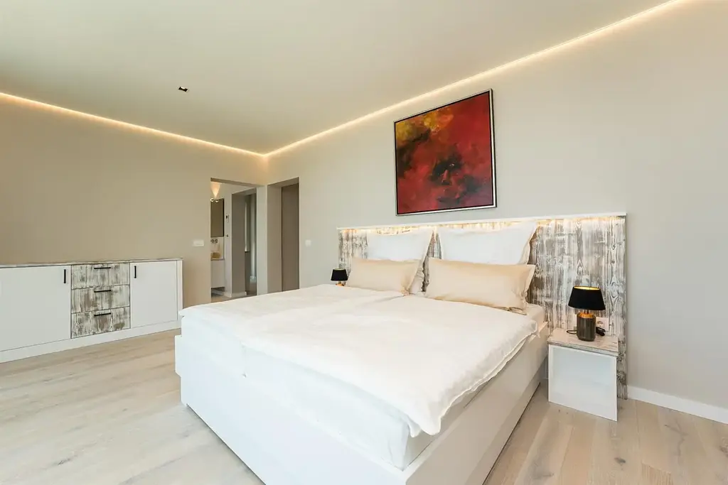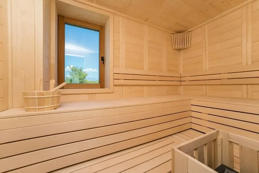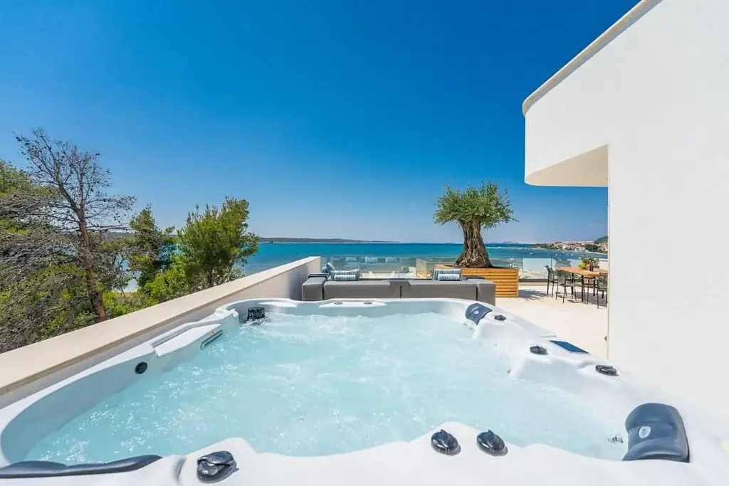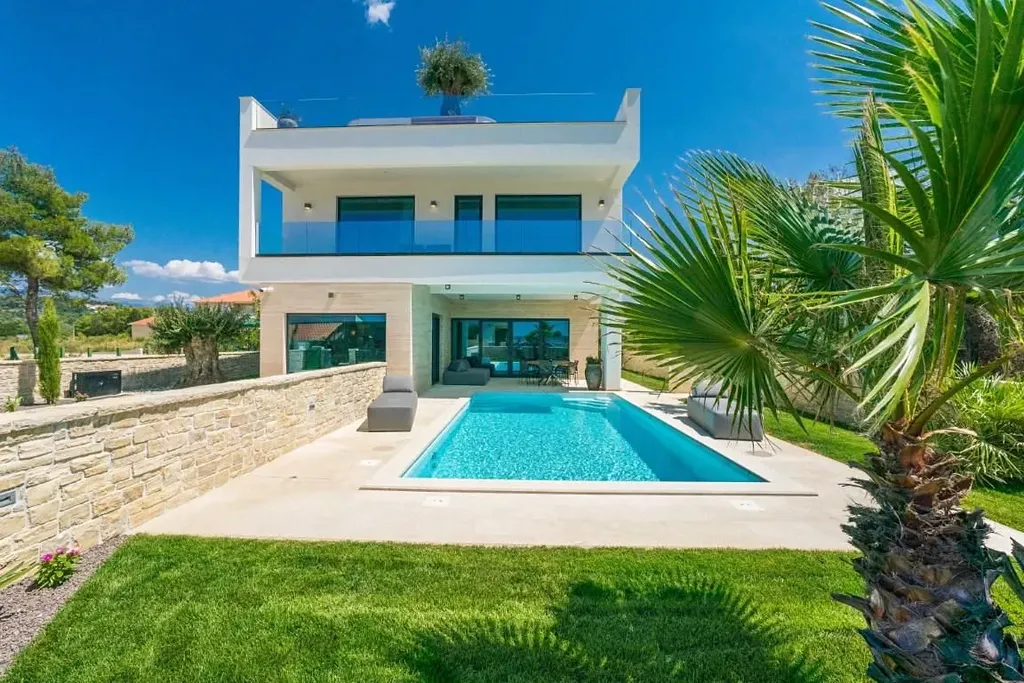 Vila se skládá z přízemí, 1. patra a střešní terasy. V přízemí je prádelna, WC, posilovna, kuchyň a jídelna a obývací pokoj, ze kterého je vstup na prostornou terasu s vyhřívaným bazénem a zahradou. V 1. patře jsou 3 ložnice s vlastními koupelnami a ve 2. patře je wellness s finskou saunou, koupelna a střešní terasa, kde je vířivka a letní kuchyně. Střešní terasa nabízí krásný výhled na moře, je zde příjemné posezení a 300 let starý dekorativní olivovník.