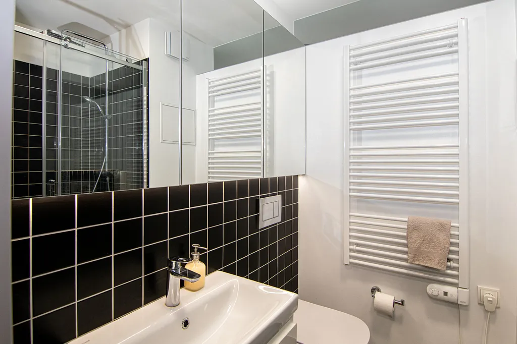Mezi koupelnou a kuchyní bylo v horní části příčky instalováno mléčné sklo, které dodává koupelně denní světlo. Je to praktické a koupelně i kuchyni to dodává další zajímavý prvek.