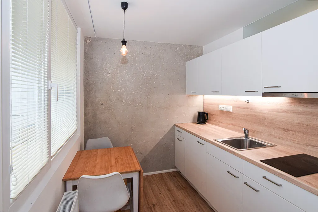 Kuchyňská linka je na míru vyrobená a disponuje vestavnou lednicí a indukční deskou s digestoří. V kuchyňském koutu byla odkryta a revitalizována panelová zeď, která nyní působí velice atraktivně.