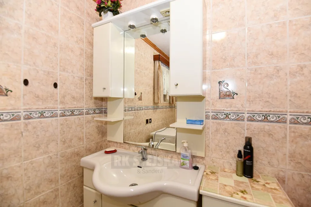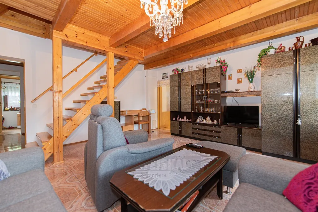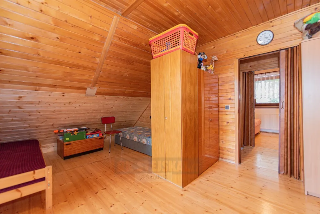 Dispozice domu je řešena prakticky s důrazem na funkčnost prostoru a skládá se z přízemí, sklepa pod úrovní terénu a obytného podkroví. Vstup je veden přes zastřešenou terasu do chodby, kde se nachází samostatná toaleta a technická místnost, kde jsou prakticky umístěny technologie se vstupem do sklepa. Na chodbu navazuje prostorný a světlý obývací pokoj propojený s kuchyní ve tvaru L, která je vybavena spotřebiči. V přízemí se dále nachází koupelna s vanou. Podkroví nabízí dvě prostorné ložnice, šatnu a další toaletu, přičemž z větší ložnice je vstup na balkon. Velkým benefitem je také zázemí na pozemku – bazén s filtrací, venkovní posezení a kůlna.