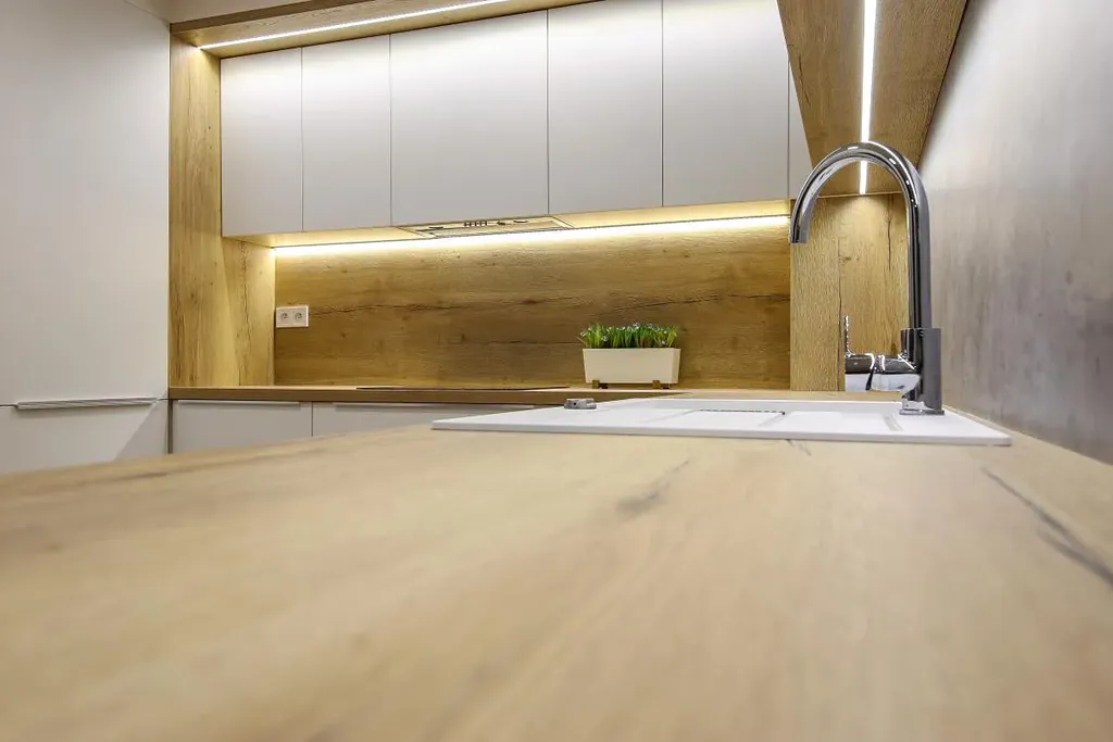 Je elegatní, celobílá v kombinaci se dřevěnou pracovní deskou a betonovými zády. V ní najdete sklokeramickou varnou desku, troubu, mikrovlnou troubu,myčku, chladničku s mrazákem, vestavěnou digestoř,granitový dřez, kompletní LED podsvětlení a dostatek zásuvek pro všechny další potřebné spotřebiče. Zásuvky mají pojezdy zn. Blum. V lince je také velkorysý prostor pro všechno co budete kdy k vaření potřebovat. V technické místnosti naleznete pračku se sušičkou.