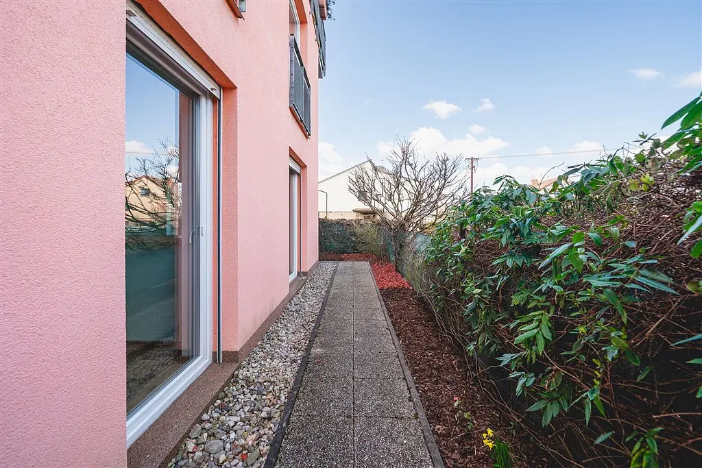 Byt je velmi dobře dispozičně řešený – všechny obytné místnosti mají balkonové dveře se vstupem na zahradu, což zajišťuje dostatek přirozeného světla po celý den. Z hlavní obytné místnosti s kuchyňským koutem je přímý vstup na dlážděnou terasu, ideální pro posezení či letní grilování.