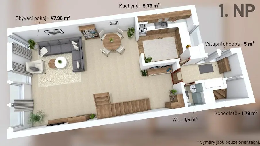 Dominantou domu je obývací pokoj s kuchyní a přímým vstupem na terasu a zahradu. Dispozice je navržená tak, aby fungovala v běžném životě a nabídla dostatek prostoru pro všechny členy domácnosti.