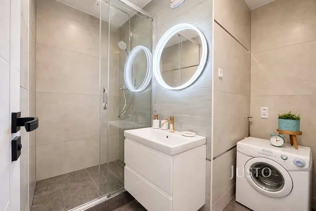 • koupelna se sprchovým koutem, vestavěným umyvadlem ve skříňce a pračkou,