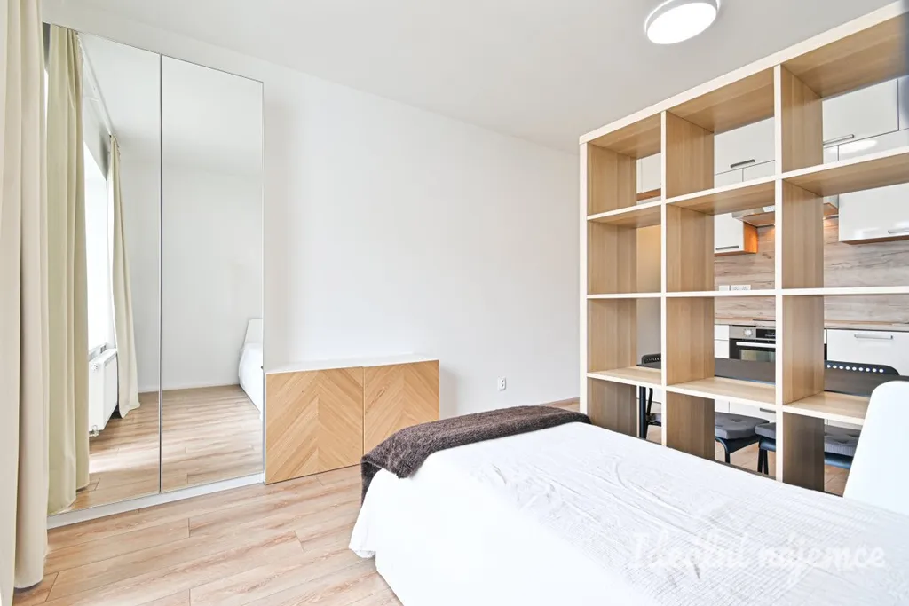 Hlavní obytný prostor tvoří světlý pokoj s kuchyňským koutem a vstupem na balkon. Kuchyně je vybavena spotřebiči, konkrétně lednicí, myčkou, mikrovlnnou troubou, troubou a dvouplotýnkovou indukční deskou. V obytné části zůstává také postel a šatní skříň, v koupelně pak pračka. Byt je tak připraven k nastěhování bez nutnosti dalších větších investic.