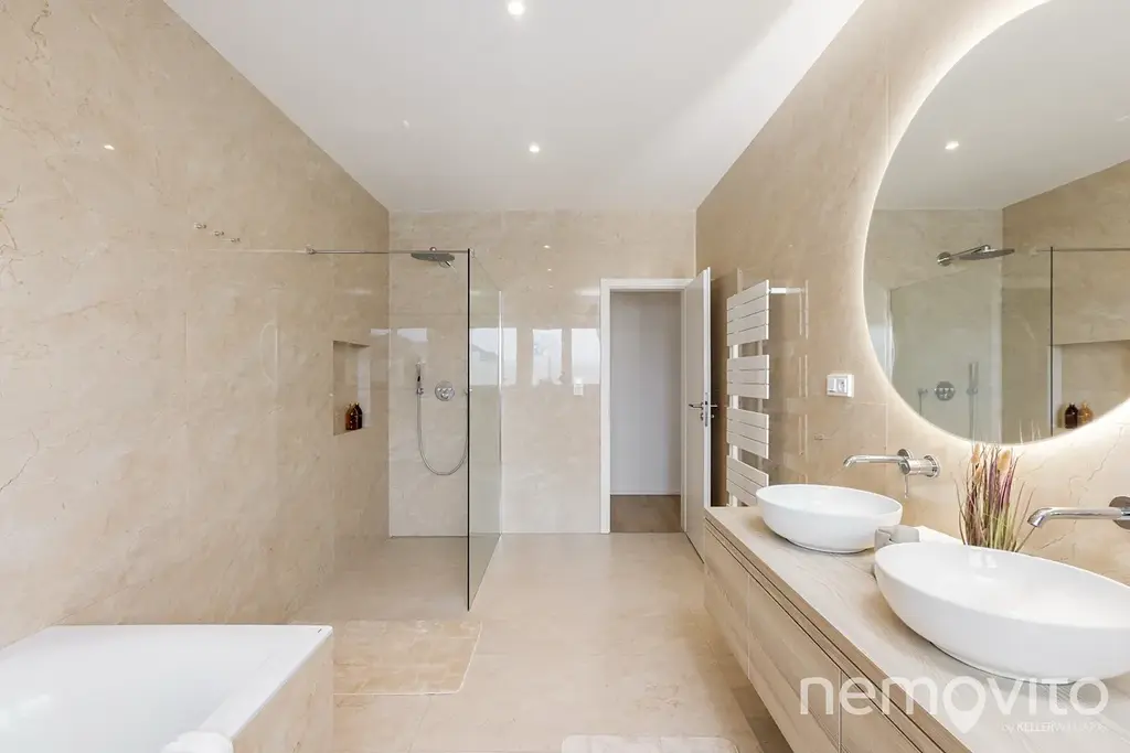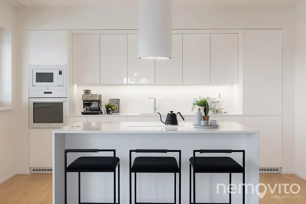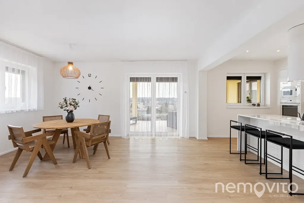 Obývací pokoj s kuchyňským koutem má nadstandardní velikost 55 m2. Ke kuchyni patří ještě velká komora (8 m2) a na obývák navazuje oddělená část, která funguje jako 15 m2 pracovna. Skutečně velkorysé pojetí, kde je na všechno dost místa, ale při zachování nízkých provozních nákladů. Interiér je laděn do světlých a jemných tónů a je klimatizován.