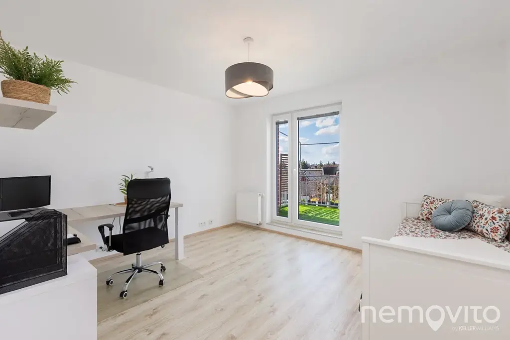 Je umístěn ve třetím podlaží budovy z roku 2019 a je v perfektním stavu bez nutných investic. Veškerý nábytek v obýváku a vestavěné prvky jsou řešeny na zakázku, přičemž kuchyňská linka je skutečná rozměrná a obsahuje velkou spoustu úložných prostor, kterým však asistuje ještě rozměrná komora (5 m2). Z každé místnosti bytu je výstup na terasu - ta u obýváku je užší, vzadu u ložnic je plocha celých 19 m2 a orientace na severozápad.