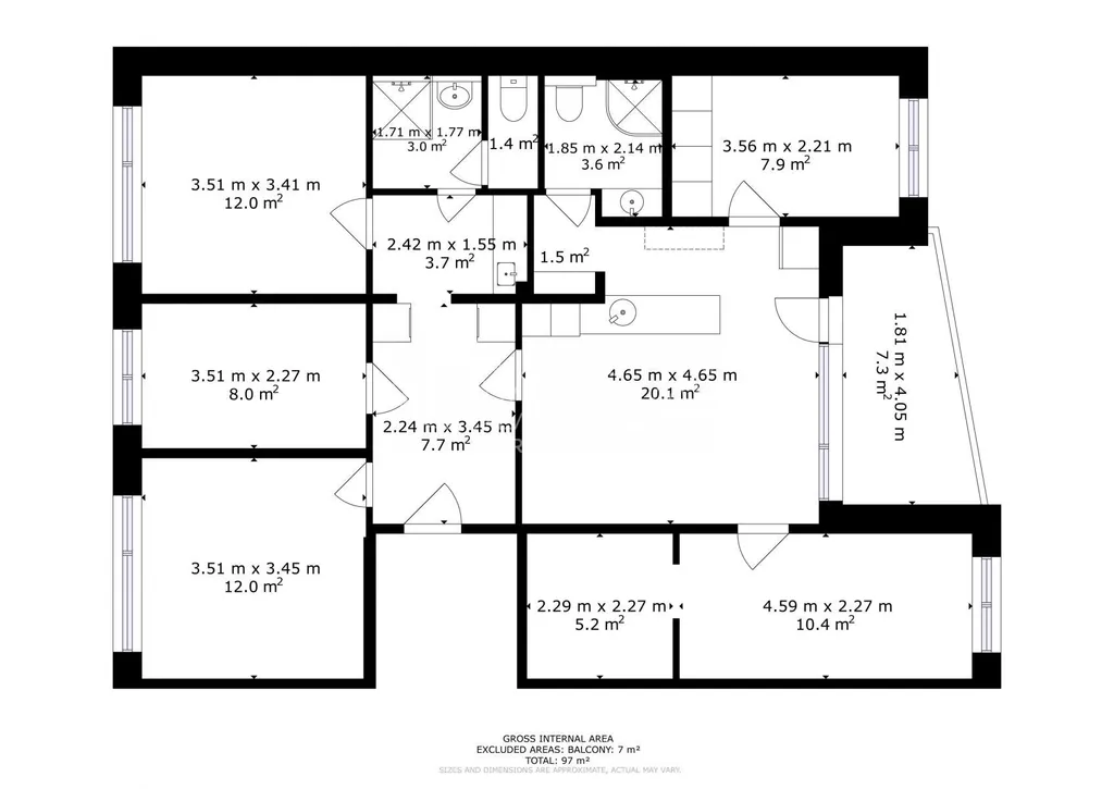 Výměra: 97 m and sup2; interiéru + 7 m and sup2; lodžie + 2 m and sup2; sklep.