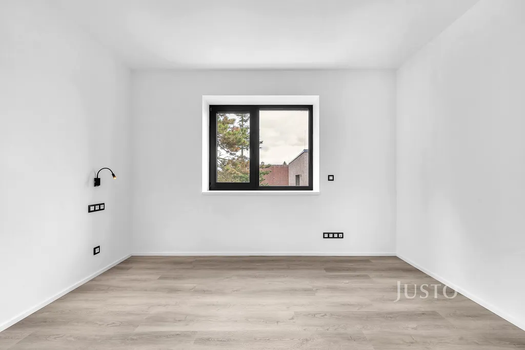 Interiér bytu je světlý díky velkým hliníkovým oknům s venkovními roletami. Podlahové vytápění s tepelným čerpadlem zajišťuje příjemné klima po celý rok, komfort umocňuje i klimatizace. V koupelnách dominuje kvalitní velkoformátová dlažba a moderní sanita. Díky preciznímu zpracování a promyšlenému designu poskytuje byt vysoký standard bydlení.