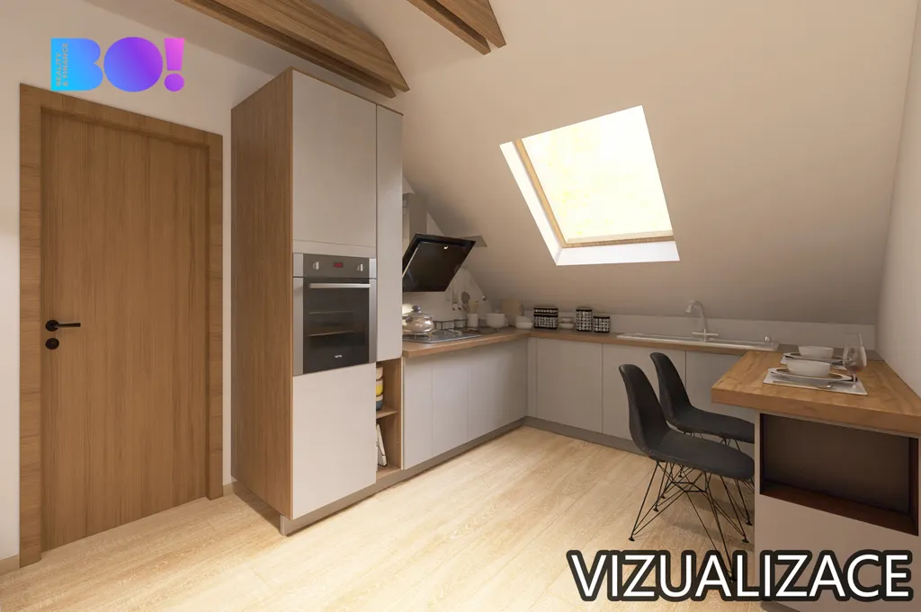 Horní patro je řešeno jako velkometrážní 1+kk s příjemným otevřeným prostorem, který působí vzdušně a světle. Zároveň se zde nabízí možnost úpravy na praktičtější 2+kk, takže nový majitel může dispozici přizpůsobit vlastním potřebám. Možnosti můžete vidět na vizualizaci a videu.