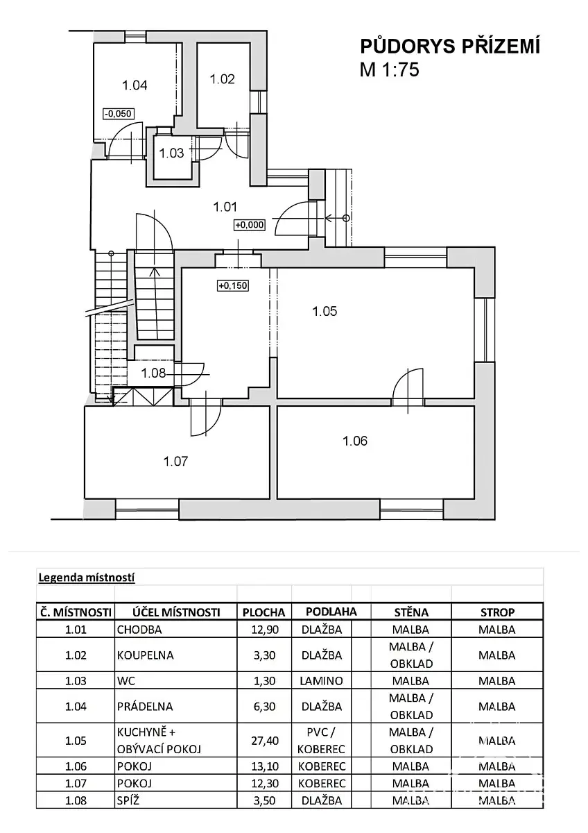 V přízemí se nachází obývací pokoj propojený s kuchyní, vedle které je k dispozici prostorná spíž. Dále zde najdete dva samostatné pokoje, chodbu, koupelnu, samostatné WC, prádelnu a vstup do sklepa. V podkroví jsou dva další pokoje a půdní prostory se šikminami, které nabízejí možnost dalšího využití či rozšíření obytné plochy.