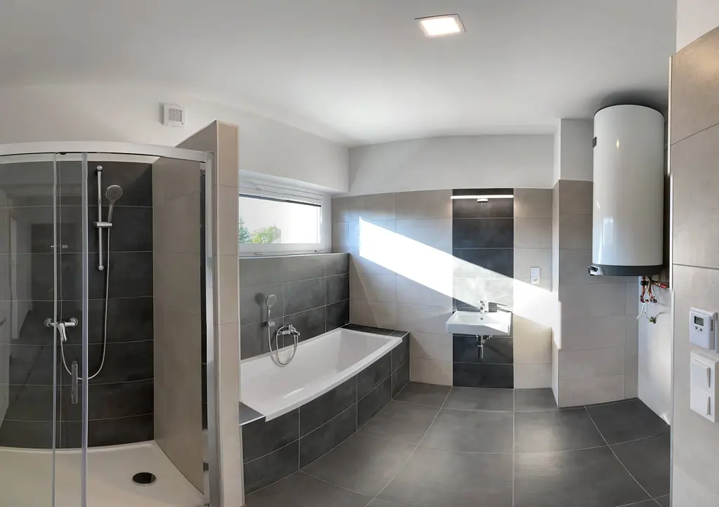 Vytápění je řešeno elektrickým podlahovým topením, ohřev vody elektrickým bojlerem.