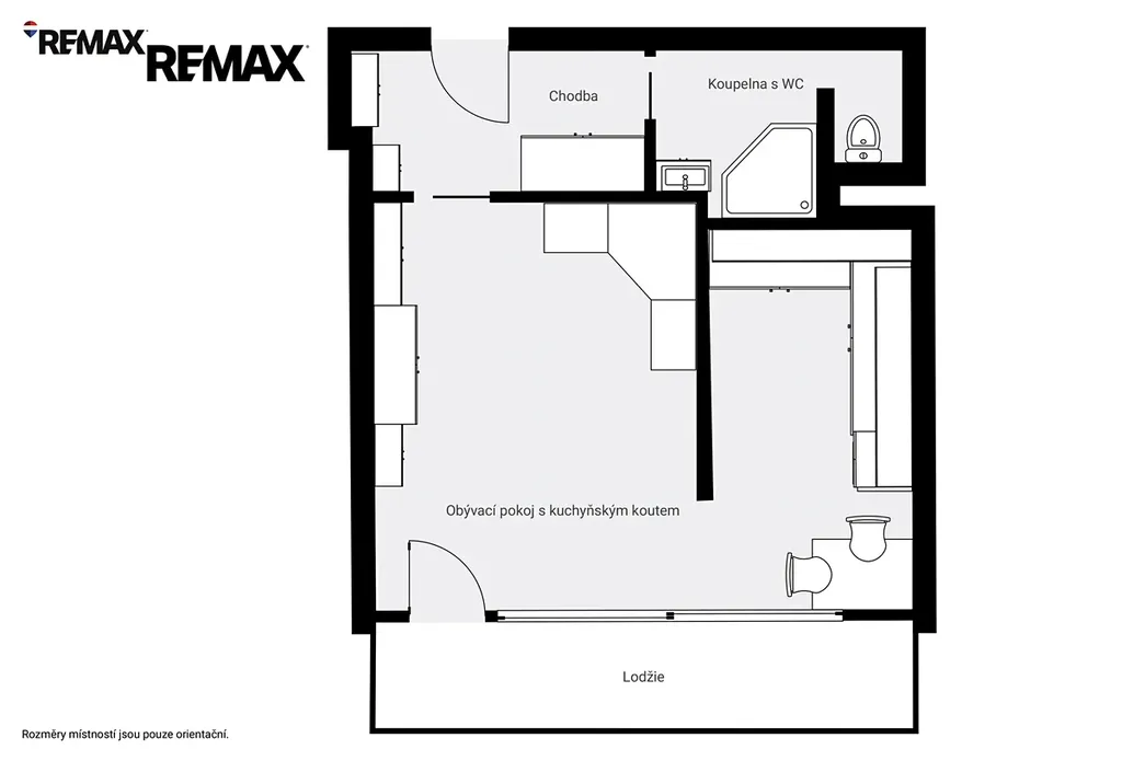Dispozici tvoří obytný pokoj, samostatná kuchyň, vstupní chodba s velkorysým úložným prostorem, koupelna se sprchovým koutem a toaletou a praktická komora. Velkým benefitem je prostorná lodžie, která příjemně rozšiřuje obytný prostor.
