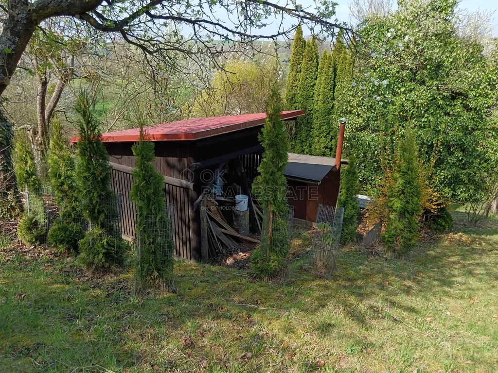 Zázemí pro víkendy: Na pozemku stojí dvě chatky. Jedna slouží jako útulné útočiště pro přespání, druhá jako praktický sklad pro nářadí.