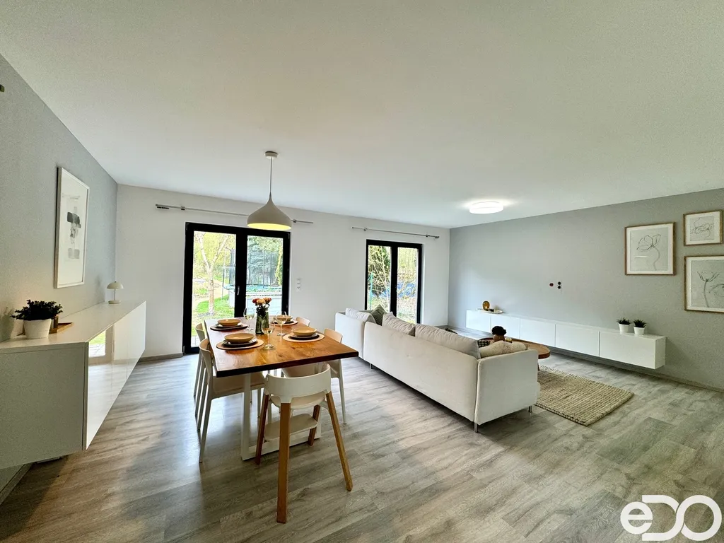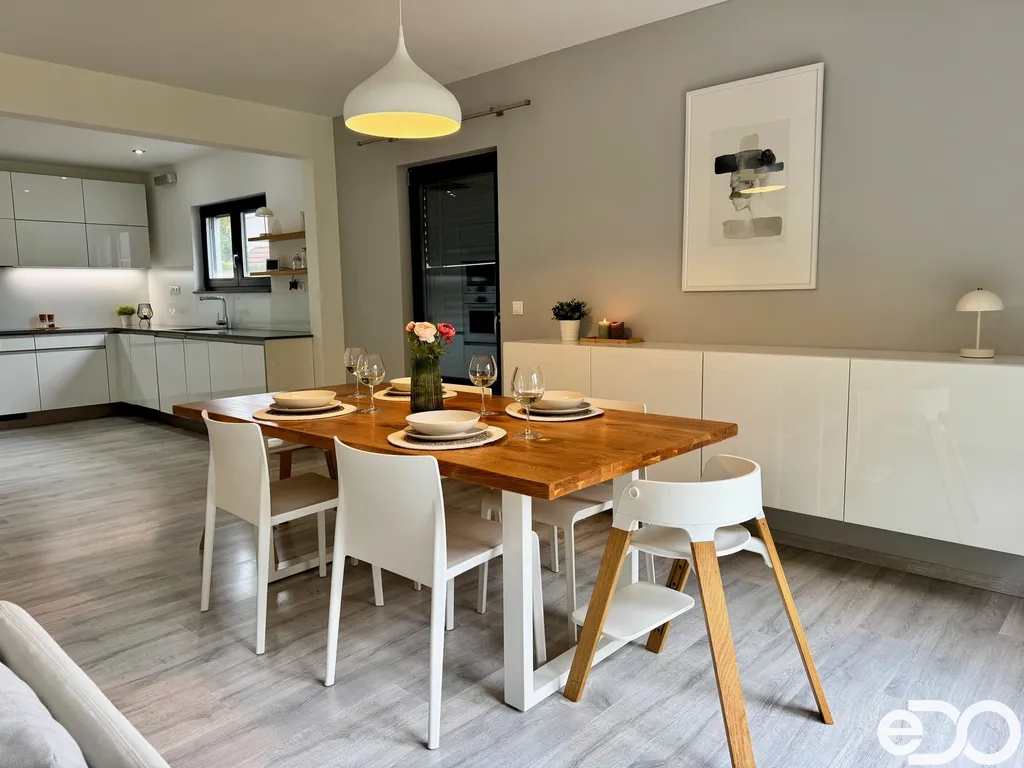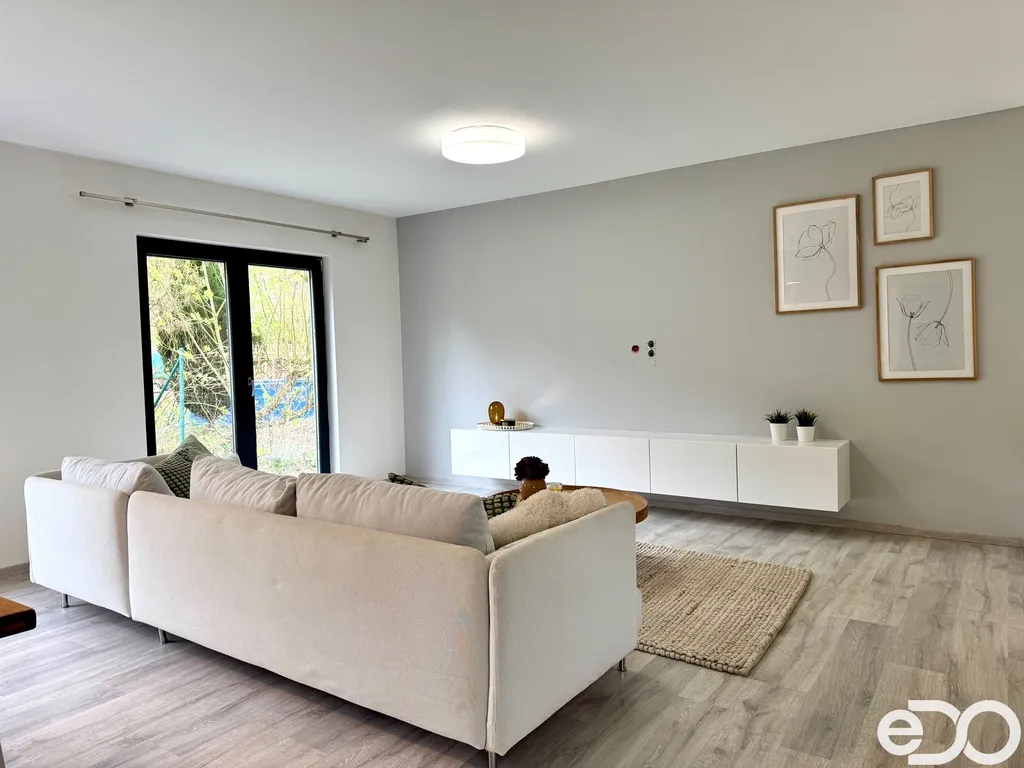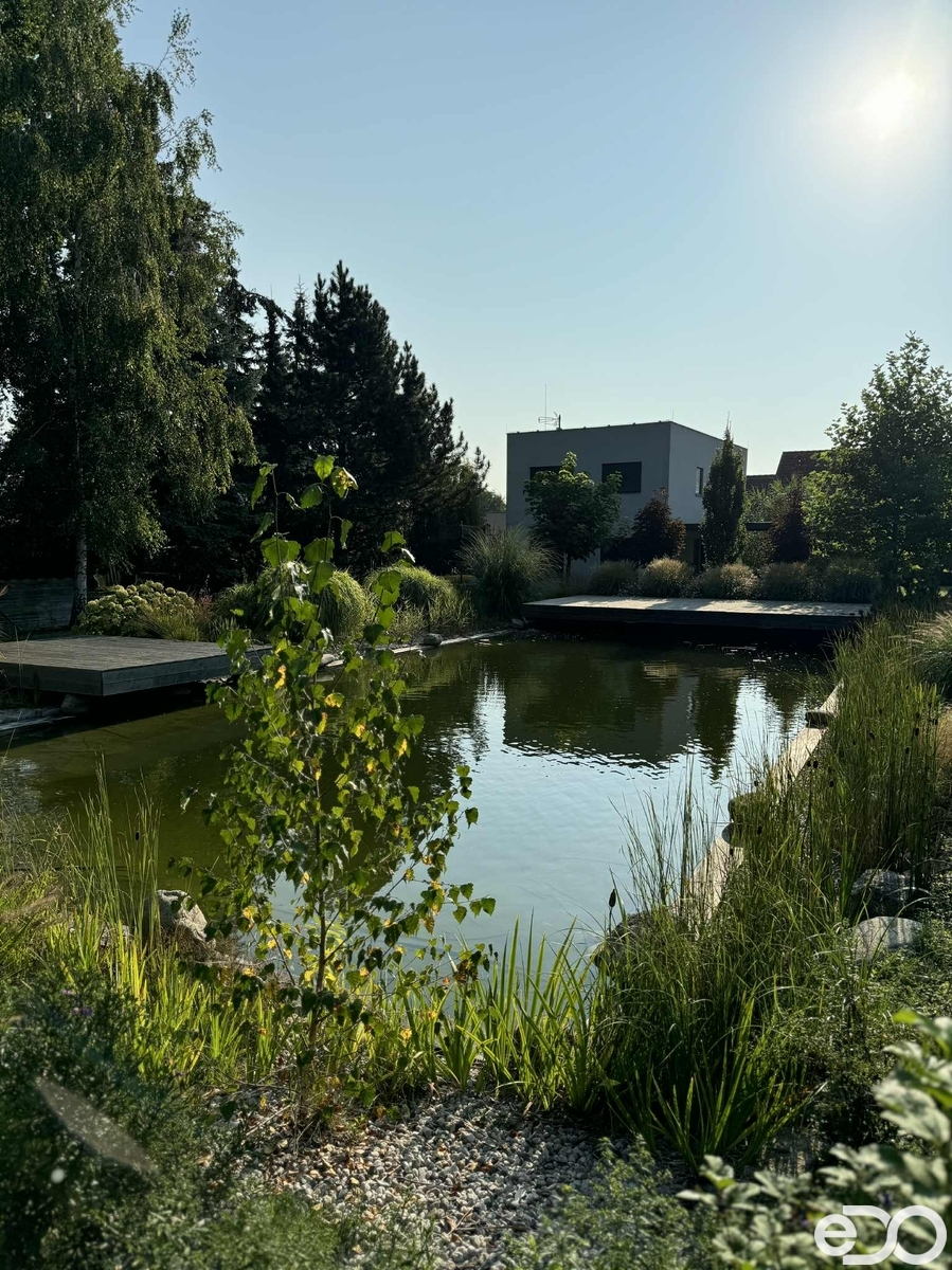 Dominantou nemovitosti je prostorný obývací pokoj s kuchyňským koutem a přímým vstupem na velkou terasu, která navazuje na udržovanou zahradu. Ta poskytuje dostatek soukromí, nachází se zde okrasné jezírko i zázemí pro děti. Údržba zahrady je nenáročná – stačí pravidelné sekání trávy, o začátek a konec sezóny i průběžnou péči se stará majitel.