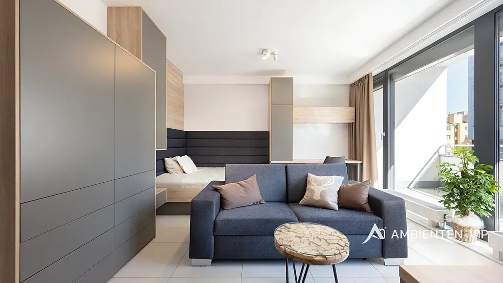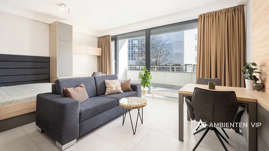 Byt disponuje prostorným obývacím pokojem s odděleným kuchyňským koutem, koupelnou s toaletou a sprchovým koutem. V obývacím prostoru se nachází přímý vstup na prostornou lodžií. Kuchyně je vybavena moderními vestavěnými spotřebiči a nabízí vám mnoho úložného prostoru. Součástí obývacího pokoje je spací kout, kancelářský stůl, jídelní stůl a mnoho uložených prostor (viz fotografie).