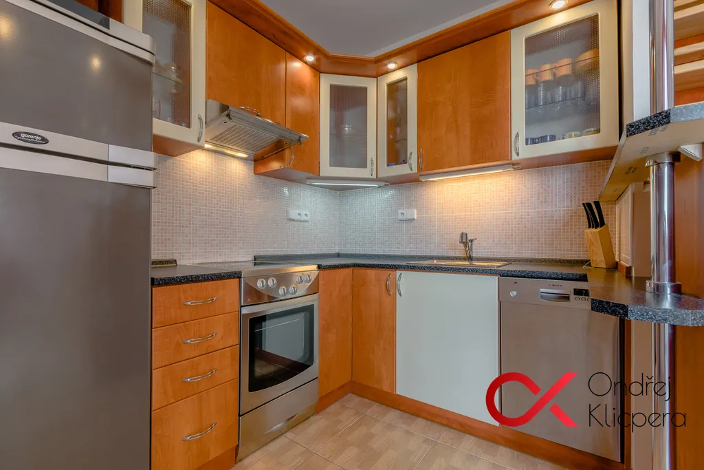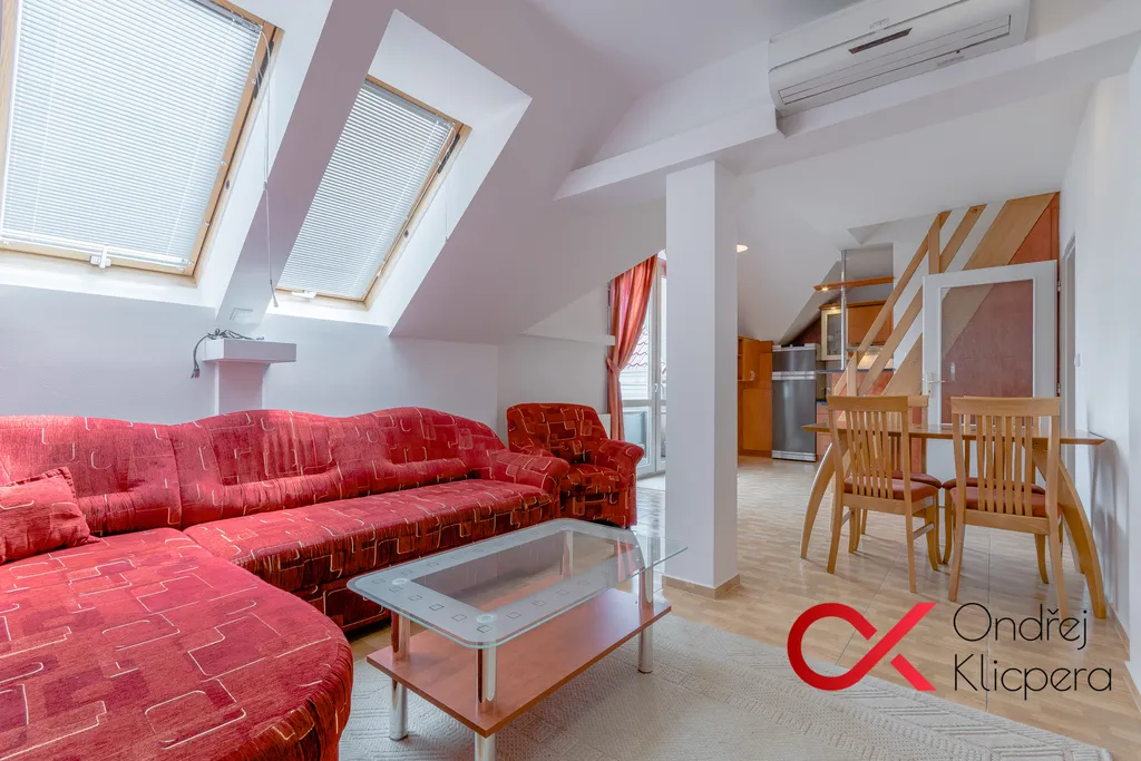 Obývací pokoj je propojený s plně vybavenou kuchyní (lednice kombinovaný sporák se sklokeramickou deskou, myčka, digestoř, mikrovlnná trouba) prostor mezi kuchyní a obývákem rozděluje jídelní stůl. Z obývacího pokoje je vstup na balkon odkud je krásný výhled na krajiny a po dřevěných schodech také vstup do ložnice nebo pracovny, která se nachází v podkroví. Podkrovní a obývací pokoj jsou klimatizované.