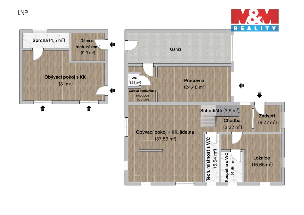 Na pozemku o rozloze 1 236 m² se nachází rodinná rezidence s celkem 266 m² užitné plochy rozdělené do tří samostatných částí.