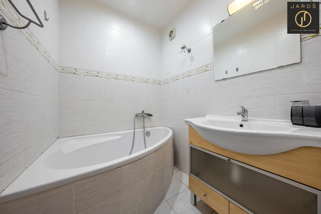 Byt disponuje vybavenou kuchyní s moderní kuchyňskou linkou a spotřebiči, včetně sporáku, trouby, lednice, myčky a pračky. V obývacím pokoji je pohodlná sedací souprava a televize, což zajišťuje příjemné místo k relaxaci. V chodbě se nachází velká skříň na míru, která poskytuje dostatek úložného prostoru.
