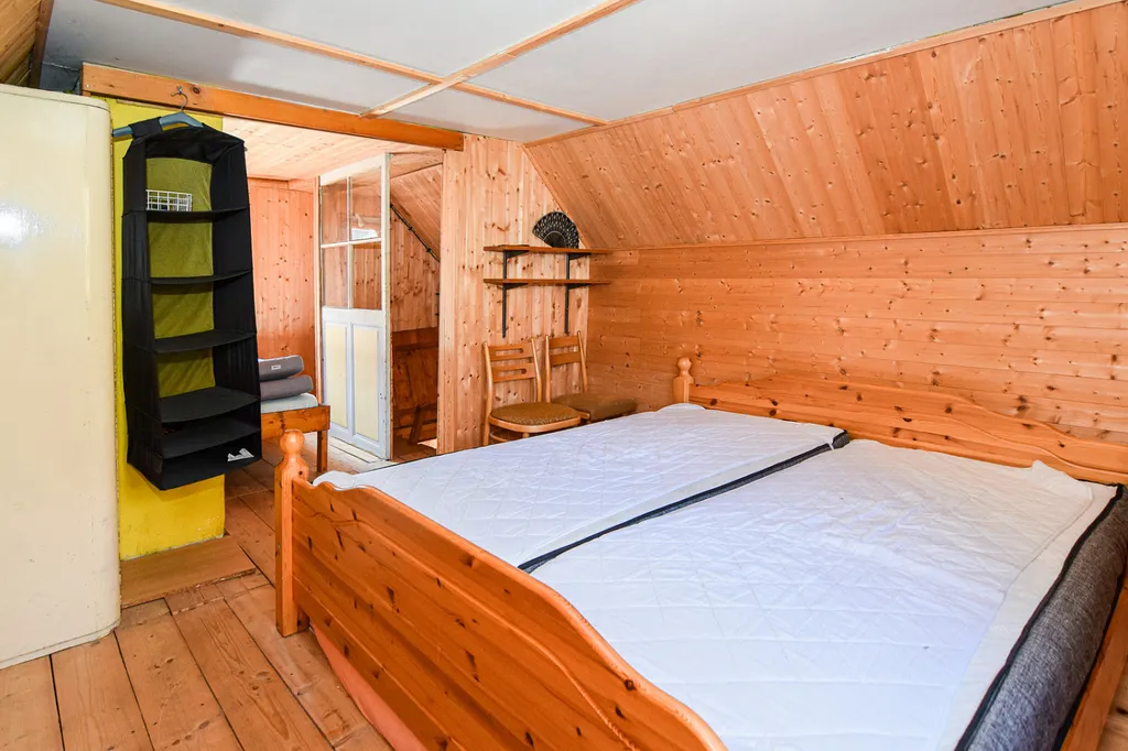 V přízemí je prostorná veranda, obývací pokoj, jídelna a kuchyně. Z kuchyně vedou schody do podkroví, kde jsou dvě částečně oddělené ložnice s dvěma manželskými postelemi.