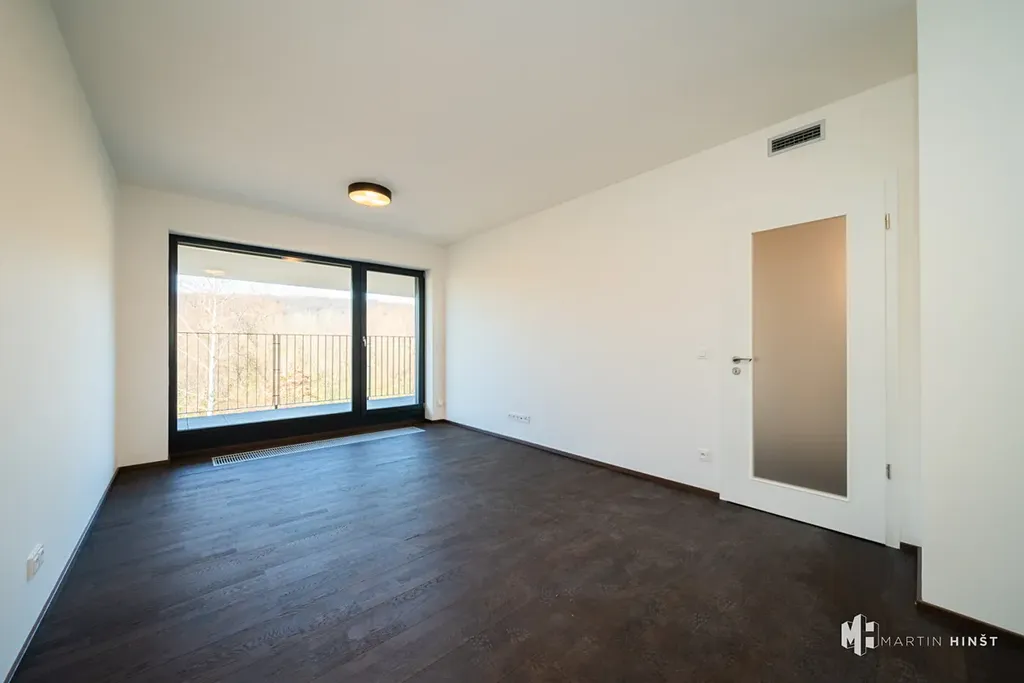 Dispozice bytu zahrnuje obývací pokoj propojený s kuchyňským koutem vybaveným moderními spotřebiči, samostatnou ložnici, předsíň s vestavěnou skříní a koupelnu s WC. Byt se pronajímá jako nevybavený, což novému nájemci umožňuje zařídit si interiér dle vlastních představ. Velkým benefitem je přímý vstup na prostorný balkon z obou obytných místností, který nabízí příjemné posezení a relaxaci s výhledem do zeleně. Komfort bydlení dále zvyšují předokenní žaluzie.
