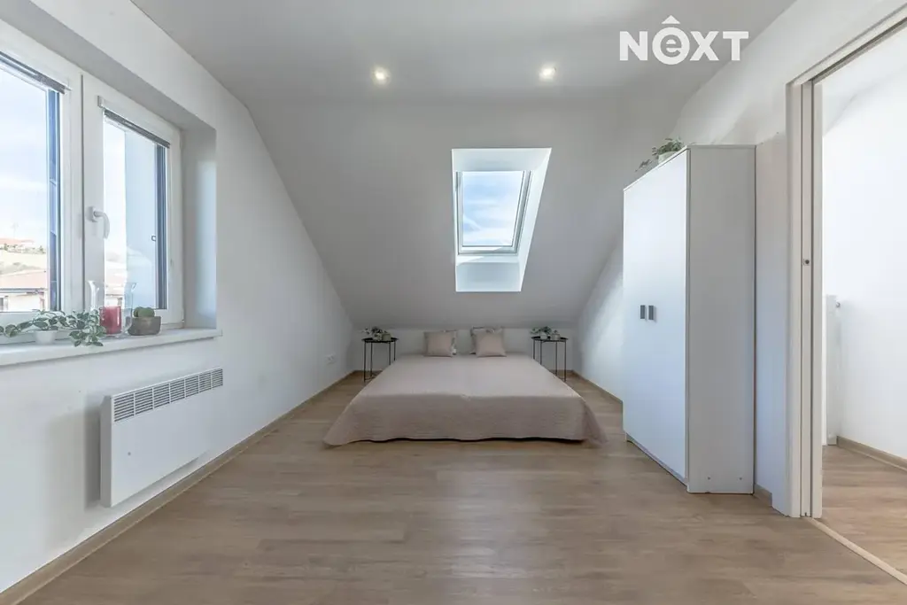 Dva prostorné světlé samostatné pokoje. Z jednoho je vstup na jižně orientovaný balkon (cca 3  m²). V patře se nachází také samostatné WC s umyvadlem.