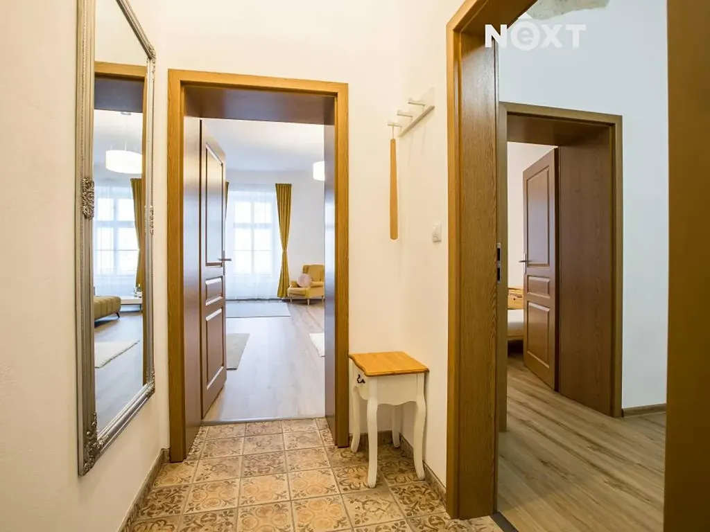 Byt s dispozicí 2+1 prošel kompletní a velmi vkusnou rekonstrukcí, díky které působí moderně, útulně a zároveň respektuje charakter původní městské zástavby. Vysoké stropy dodávají interiéru vzdušnost a opticky jej ještě více zvětšují, velká okna zajišťují dostatek denního světla po celý den a zároveň nabízejí příjemný výhled přímo na náměstí.