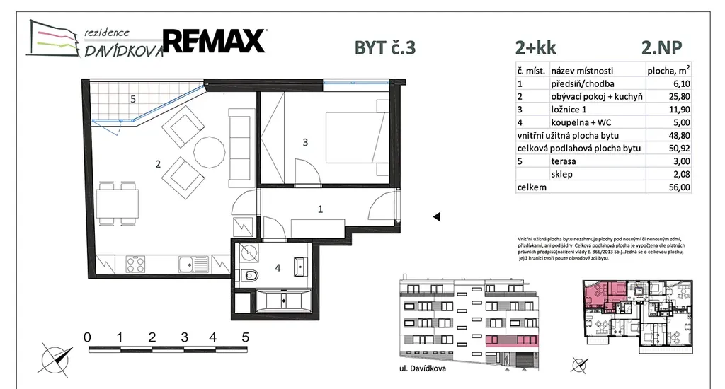 Byt s vnitřní užitnou plochou 51 m2 + terasa 3 m2. K bytu patří garážové stání a sklepní kóje.