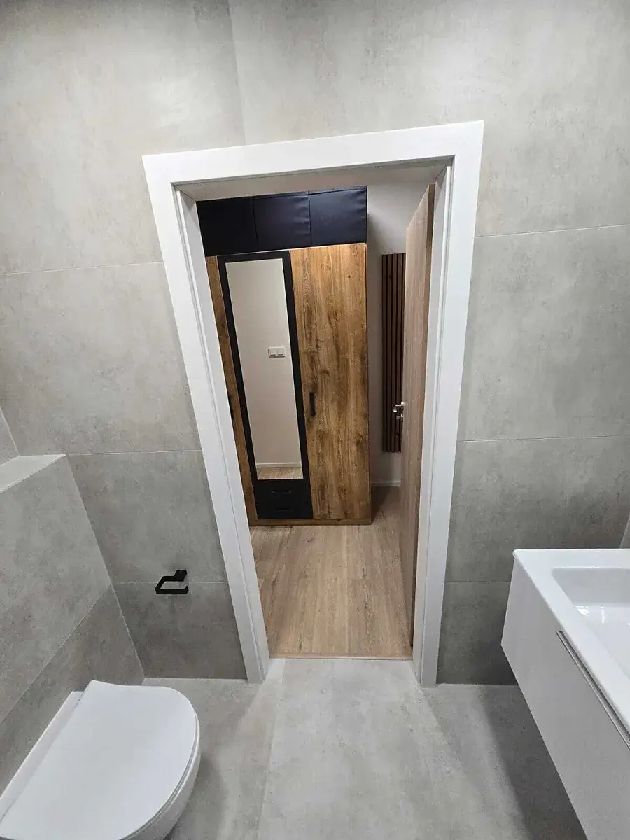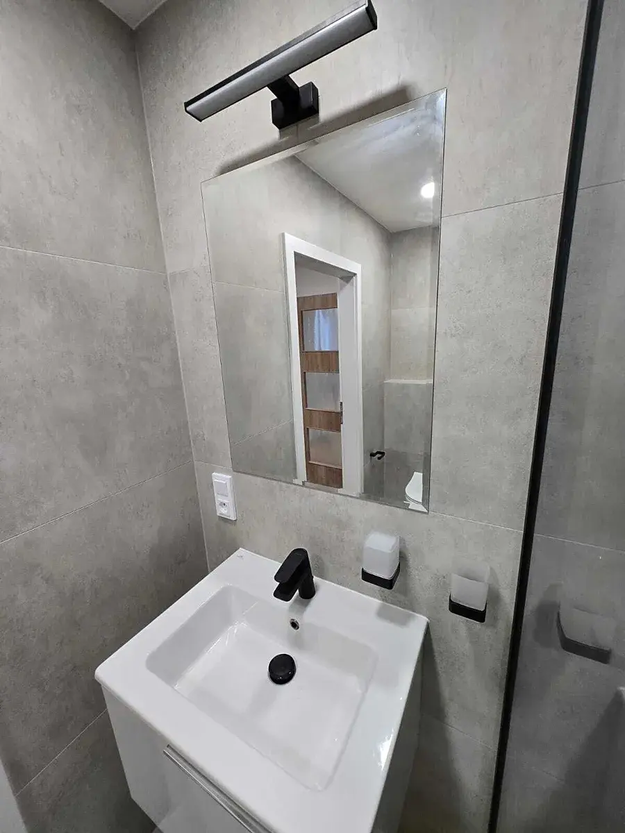 Koupelna prošla při kompletní rekonstrukci dechberoucí proměnou, která znamenala změnu dispozice i nadčasový design. Kombinace šedých velkoformátových obkladů, elegantní černé baterie. Zvětšený sprchový kout je opatřen skleněnými dveřmi a celodenní únavu můžete ze sebe smýt pod sprchou se systémem padajícího deště. Závěsná toaleta se systémem Grohe.