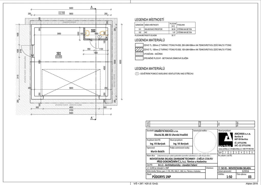 - Konstrukce: Ytong tl 250 mm, vazníkový krov, sedlová střecha s plechovou krytinou