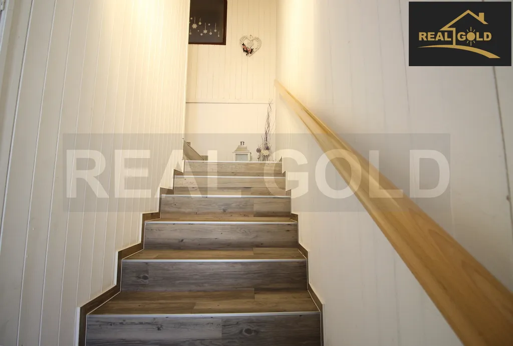2) 1. patro: chodba, ložnice, WC, kuchyň (kuchyňská linka se spotřebiči), společenská místnost se vstupem na dvorek a po schodech na zahradu, obývací pokoj s jídelnou, a schodištěm do 2. patra