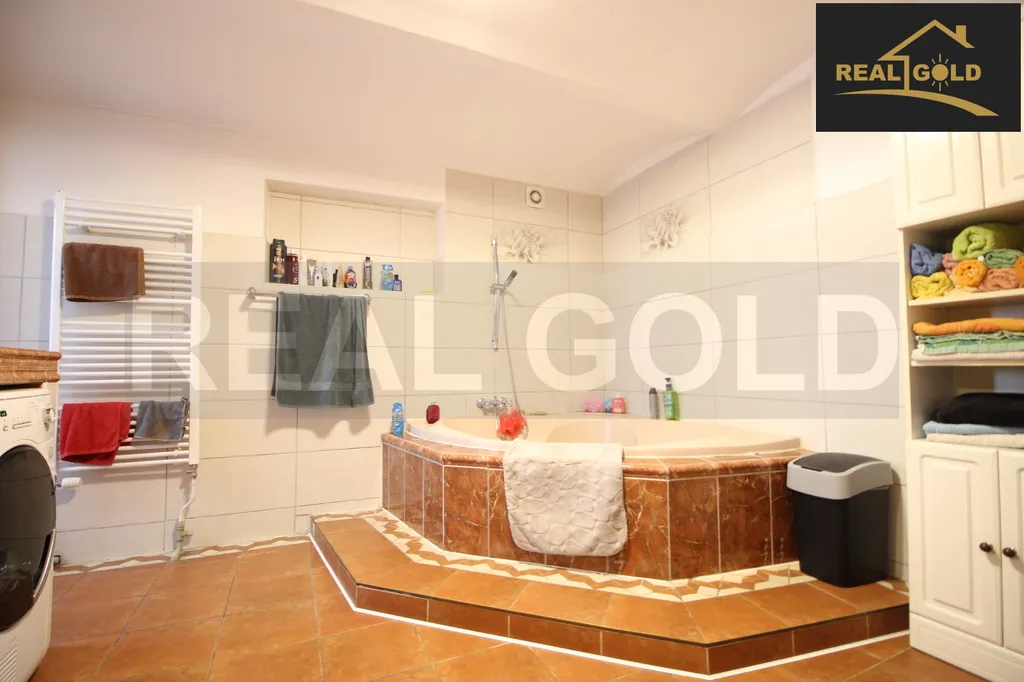 1) přízemí: vstupní chodba/zádveří, schodiště do 1.patra, šatna a 2 koupelny -jedna s masážním sprchovým koutem, WC a technickým zázemím (kotel) a druhá s vanou, 2 umyvadly, pračkou, sušičkou.
