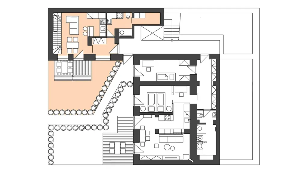 K bytu náleží předzahrádka s terasou do vnitrobloku a balkón se vstupem z horního pokoje.