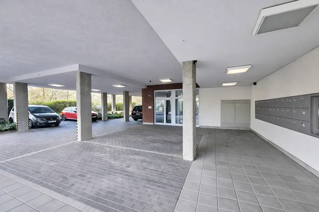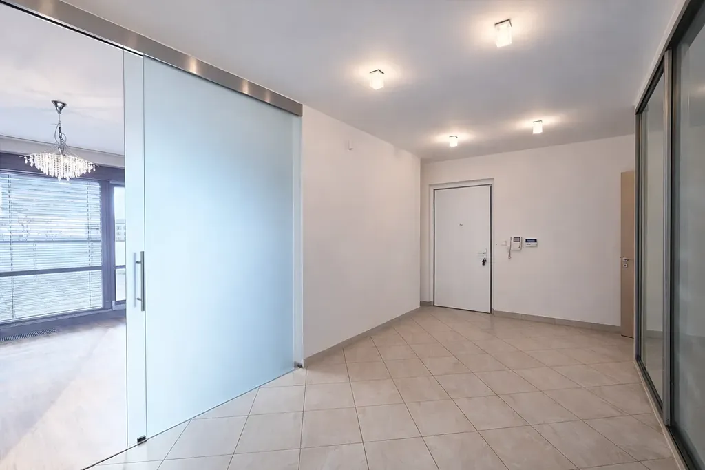 Podlahové krytiny tvoří kvalitní parkety a dlažba. Velkým benefitem je prostorná terasa, na kterou je vstup z pokojů i ložnice. Samozřejmostí je klimatizace, videotelefon, venkovní žaluzie a další nadstandardní vybavení.K bytu je možné mít za připlatek 2 parkovací stáni,