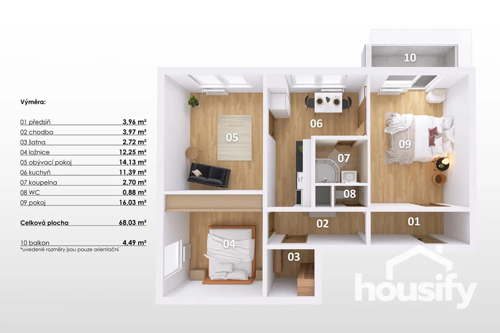 Byt nabízí prakticky řešenou dispozici s dostatkem prostoru. Jistě oceníte i praktickou šatnu, která nabízí dostatek místa pro uložení sezónních věcí i úklidových potřeb. Zasklený balkon poskytuje příjemné místo pro odpočinek v průběhu celého roku.