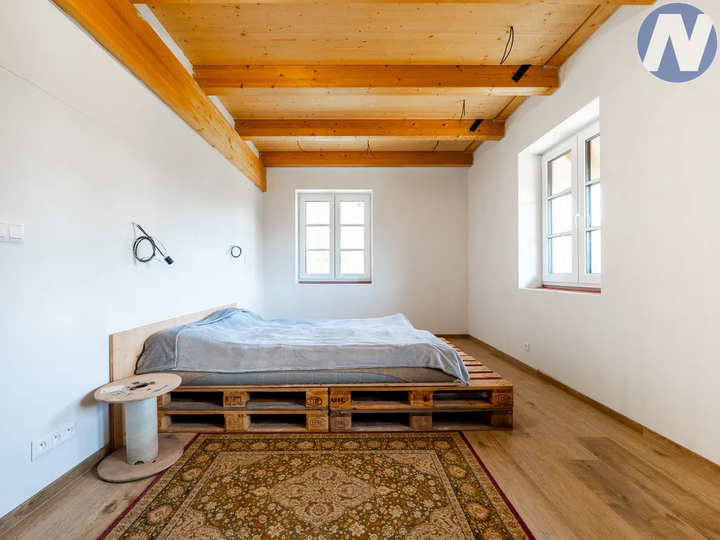 Srdcem domu je velkorysá hlavní obytná zóna s kuchyní, jídelnou a obývacím prostorem. Celý prostor působí vzdušně, světlě a reprezentativně. Dominantním prvkem jsou masivní dřevěné stropy a velká kachlová kamna, která dotvářejí jedinečnou atmosféru společenské místnosti. Dům nabízí dvě koupelny, velké množství úložných prostor a promyšlené dispoziční řešení. Podkroví bylo původně navrženo jako herna s prostorem pro kulečník, nicméně celý tento prostor lze využít i pro vytvoření dalších samostatných ložnic či soukromé obytné části.