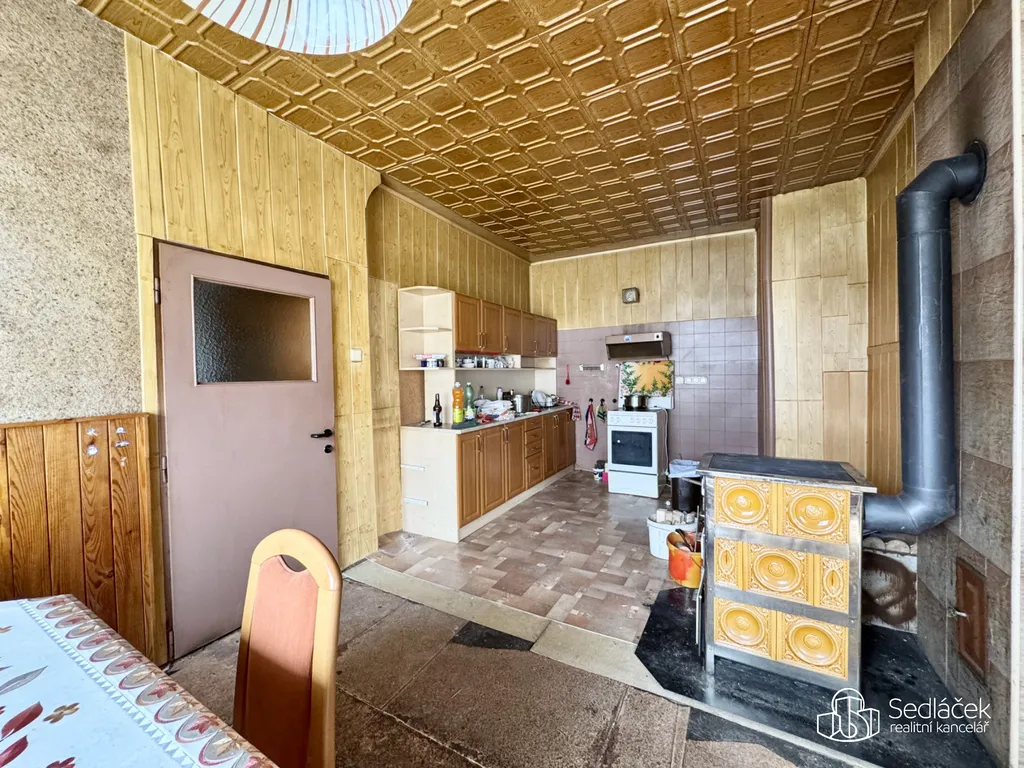 Interiér odpovídá stáří nemovitosti – původní omítky, podlahy i rozvody (elektro, voda, plyn). Vytápění je řešeno plynovými kamny a kamny na tuhá paliva. Revize komína i plynového zařízení byla provedena.