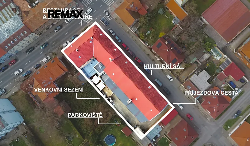 Současná budova o zastavěné ploše 1 021 m², podlahové ploše 2 349,2 m² a pozemku 1 325 m² je plně funkční a generuje zajímavou výnosnost, což umožňuje plynulé financování budoucí transformace. Objekt zahrnuje restauraci s kompletním zázemím, prostory bývalé sokolovny a kulturního sálu, sedm ubytovacích jednotek, sklepní prostory a rozsáhlou půdu připravenou pro vestavbu. Konstrukčně jde o stabilní stavbu občanské vybavenosti, částečně zateplenou, s rekonstruovanou sedlovou střechou a napojením na veškeré inženýrské sítě.