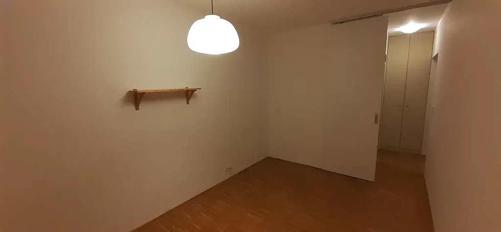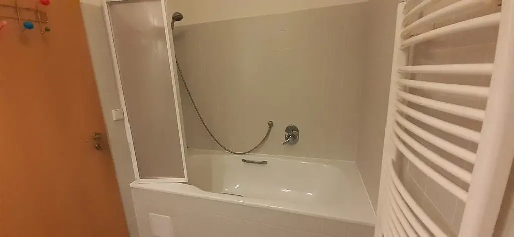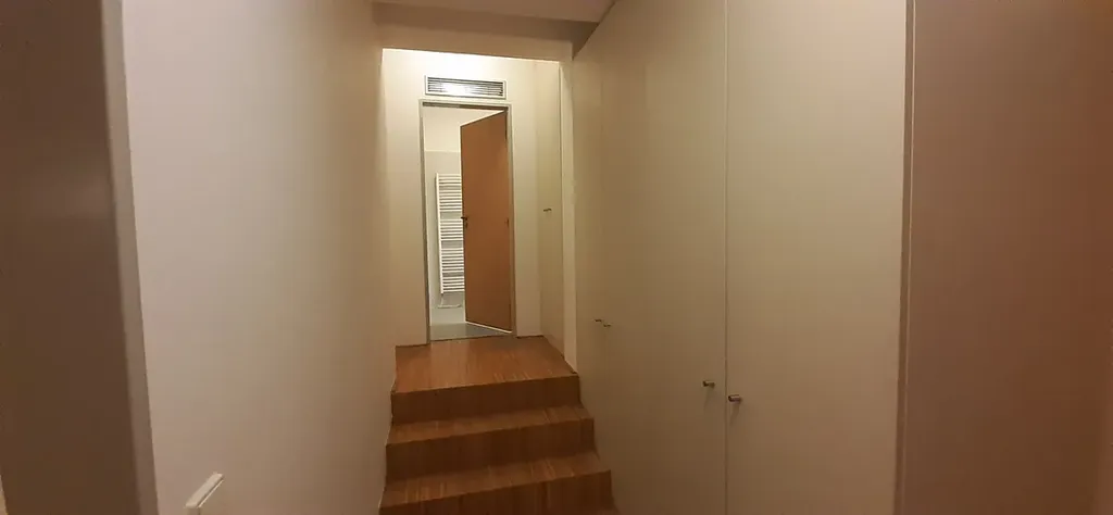 Po pár schůdcích vystoupáme chodbou do další úrovně bytu, kde se nachází pokoj se samostatným vstupem a posuvnými dveřmi a u něj je koupelna s vanou a WC.