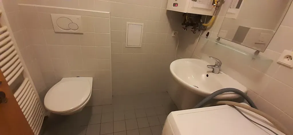 Před tímto pokojem je toaleta s umyvadlem i s místem na pračku.