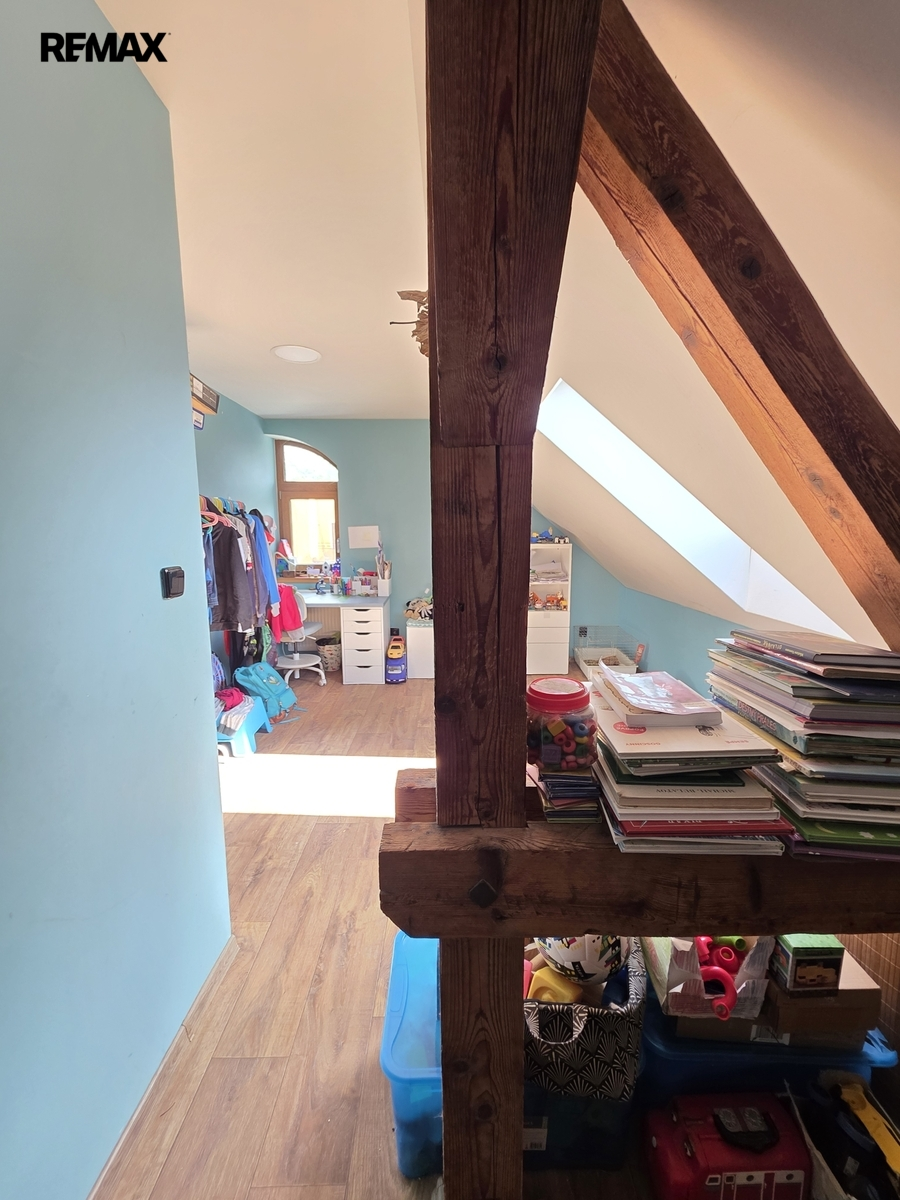 V podkroví je nově vybudovaná půdní vestavba: chodba, dva obytné pokoje a místnost připravená na dokončení druhé koupelny s toaletou. Je nutná výměna střešní krytiny.