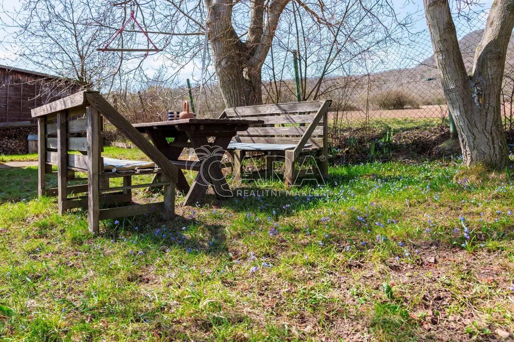 Za pozemkem se zvedá chráněné území s ikonickým vrchem Lovoš, pod kopcem tiše plyne Labe a z druhé strany se otevírá pohled na Radobýl.