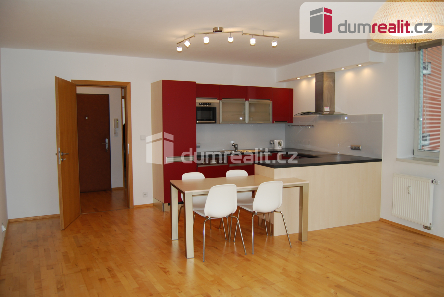 Byt disponuje prostornou vstupní chodbou, ze které je vstup do dvou samostatných pokojů a koupelny. Obývací pokoj s kuchyňským koutem nabízí krásný, ničím nerušený výhled na Prahu. Kuchyňská linka je plně vybavena spotřebiči – lednice, myčka, elektrická trouba, varná deska a digestoř.