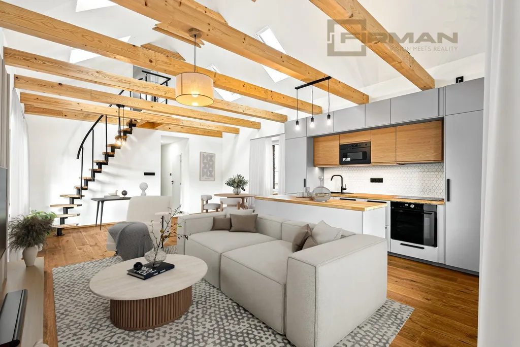 Dispozice nabízí velkolepý obývací prostor s novou moderní kuchyní, přiznanými trámy a nadstandardní výškou, který vás ohromí, jakmile do něj vstoupíte. Samostatná ložnice je klidnou zónou pro odpočinek a soukromí a pracovna s balkonem pak přináší praktické zázemí pro home office, kreativní činnost nebo úložný prostor navíc podle vašich potřeb. Krása tohoto prostoru je umocněna výhledem na největší keltské oppidium ve Střední Evropě Závist. O přítmí ve slunečných dnech se postarají dálkově ovládané střešní žaluzie.