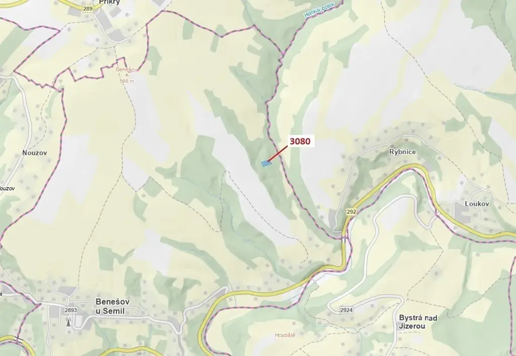 Lesní pozemek o výměře 2540 m2, parcelní číslo 3080, podíl 1/1, katastrální území Benešov u Semil, obec Benešov u Semil, obec s rozšířenou působností Semily, okres Semily, Liberecký kraj.