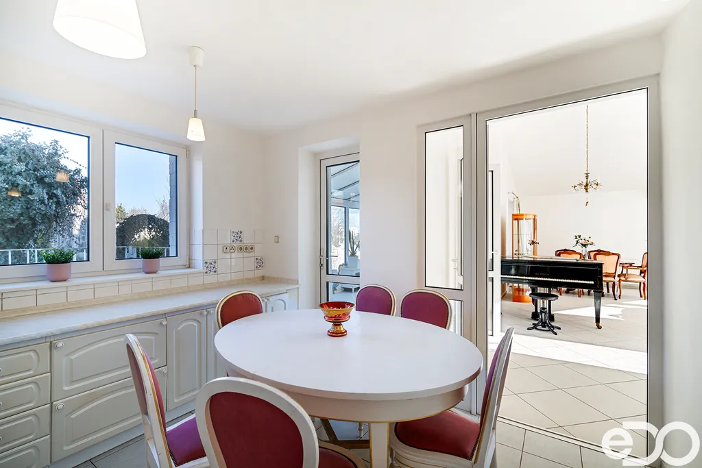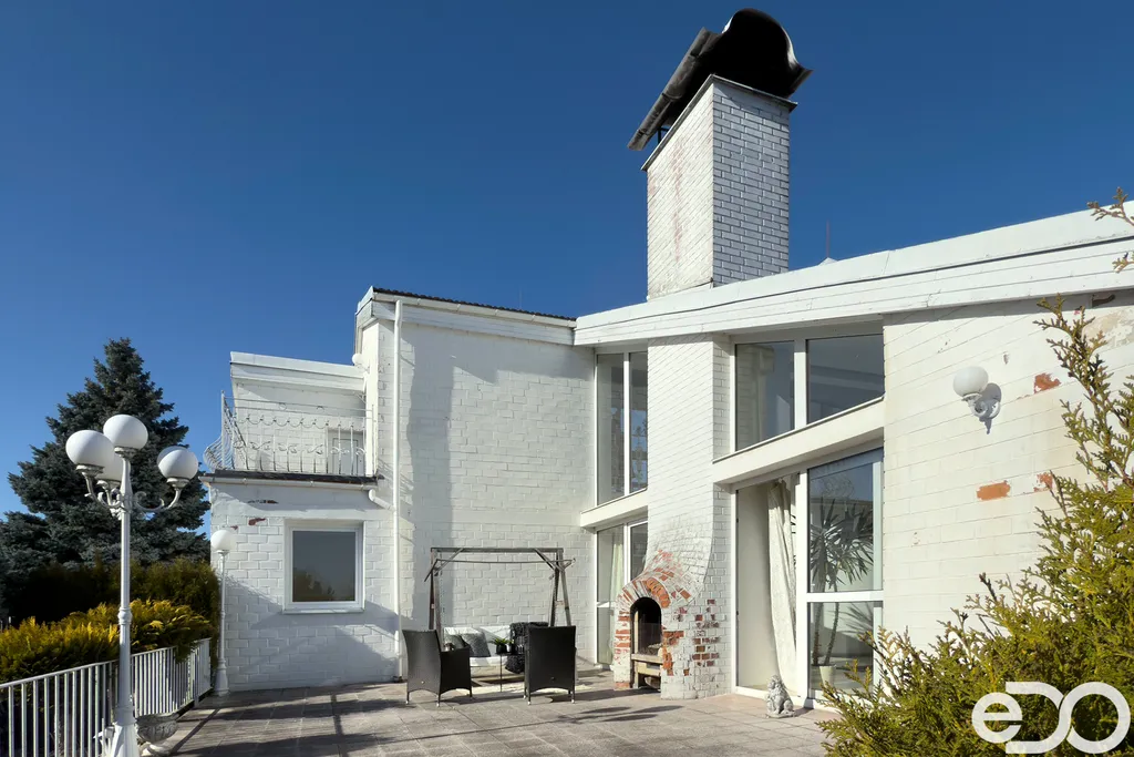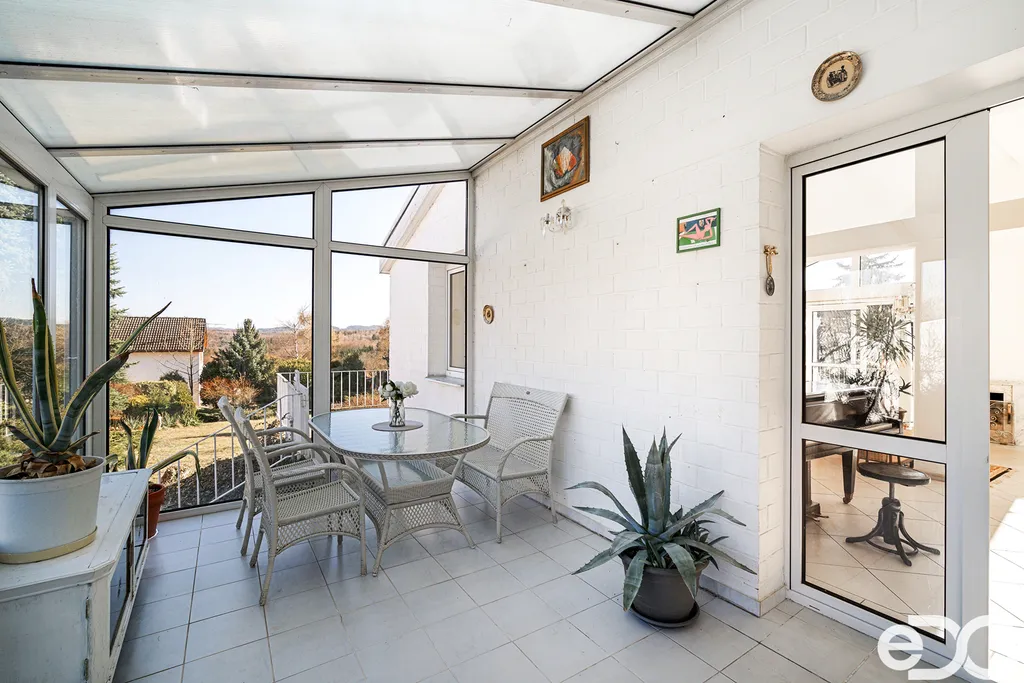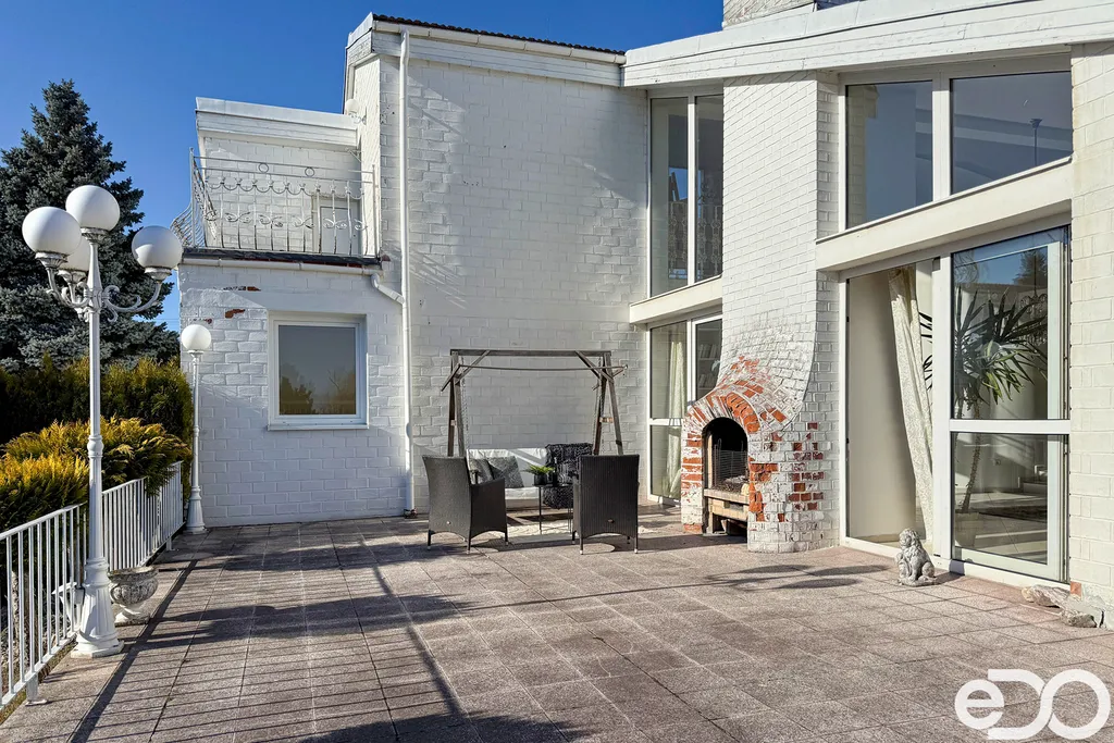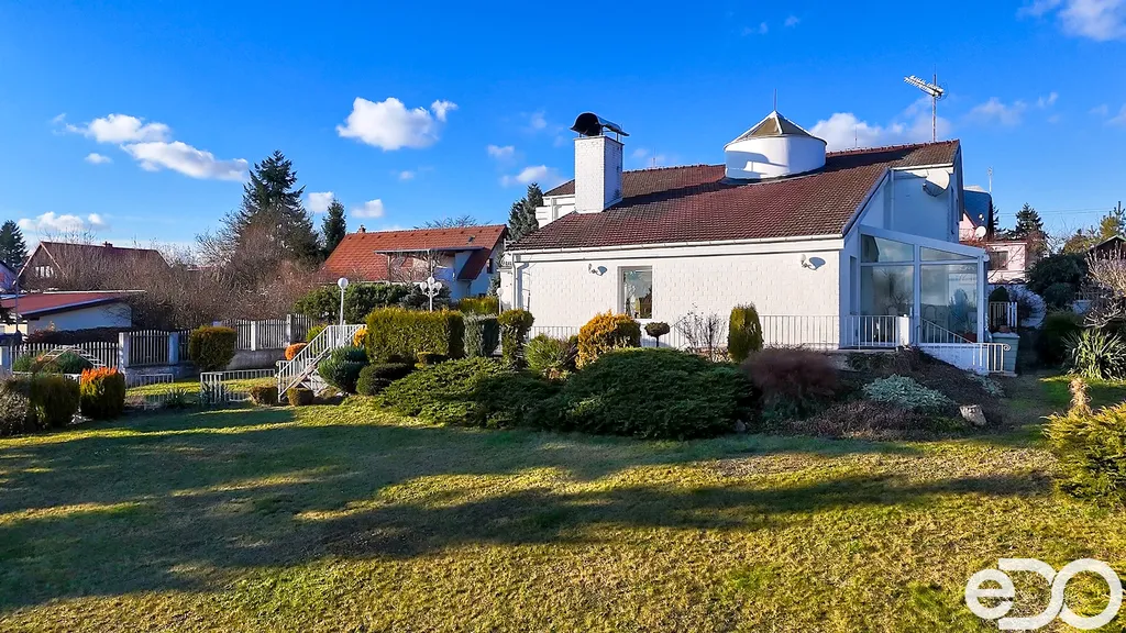 K dispozici je prostorná terasa s krbem, zimní zahrada a rozsáhlé technické zázemí v podzemním podlaží včetně dvojgaráže.